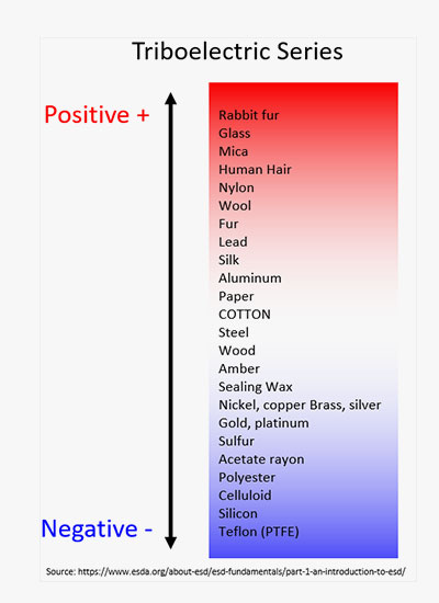 PTFE is the most negatively charged among the triboelectric series as shown in the table on the right, making it a material that easily generates static electricity.